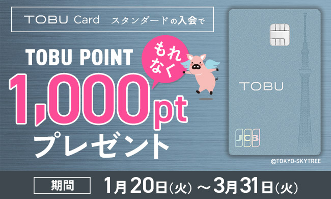 キャンペーン期間中に東武カード(スタンダード)へ申込のうえ、カードが発行された方にTOBU POINT 1,000ポイントプレゼント!※従来の東武カードからの切替の方も対象となります。