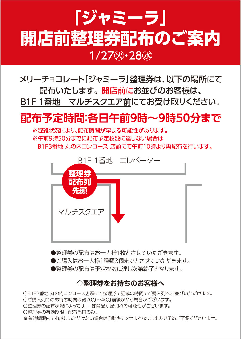 B1F 3番地特設会場(丸の内コンコース) ジャミーラ 開店前整理券配布について イベント一覧 Tweet メリーチョコレート ジャミーラ 会期 2026年1月27日(火)・28日(水) フロアマップ ※写真はイメージです。 [Mary Chocolate Jamila] ●サバーフ(朝) 1,620円 ●ライル(夜) 1,620円 ●アズラクジャミール(美しい青) 1,728円 ●ダウイ(灯) 2,160円 ●イシュク(情熱) 2,592円 ●フルム(夢) 3,024円