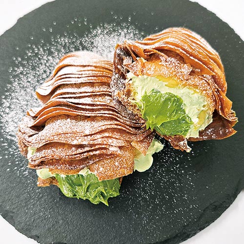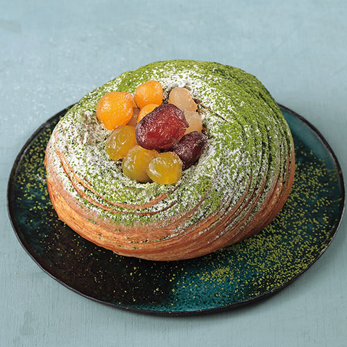 ほろ苦い抹茶クリームとお餅を、サクパリの生地で包み、上品な甘みのかのこ豆をのせました。