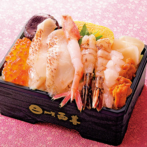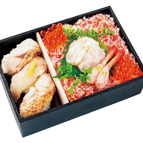 百貨店初の若廣のお弁当。鯖の漬けと〆鯖や福井県産甘エビを、旨味豊かな福井県産コシヒカリに贅沢に盛付け。