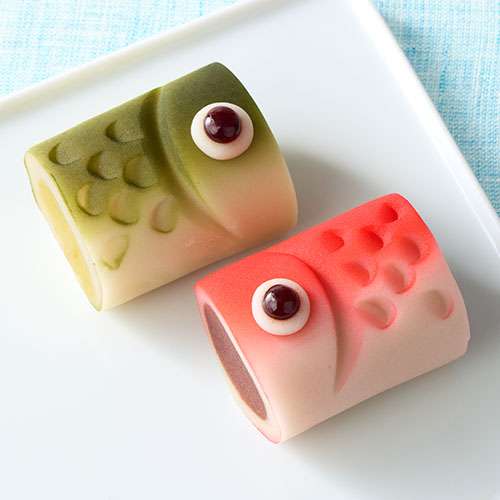 鯉のぼりをイメージした練り切りの上生菓子。緋鯉は小豆こしあん、真鯉は柚子あんで仕上げています。