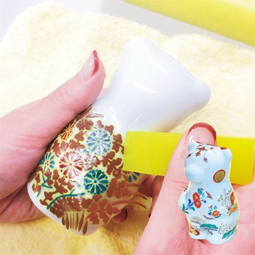 白磁のクマのフィギュア(高さ約11cm)に有田の伝統文様の転写シールを楽しく切り貼り♪