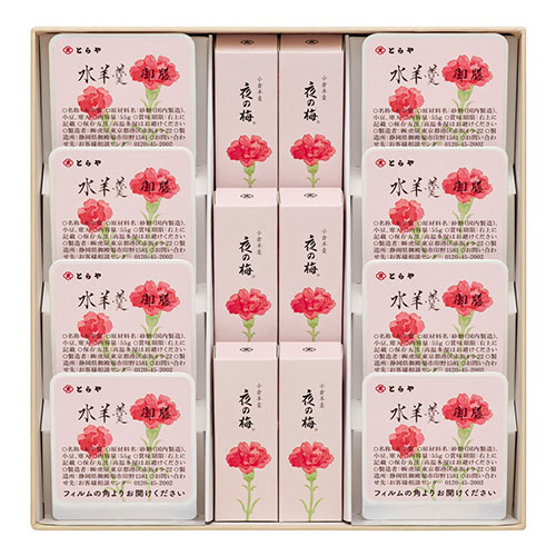 (母の日パッケージ小形羊羹 夜の梅 50g×6本、母の日パッケージ水羊羹 御膳(こし餡)55g×8個)