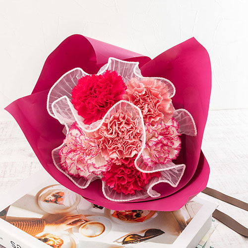 (カーネーション(濃いピンク×2、ピンク×2、複色ピンクホワイト×2)、ラッピング、リボン)