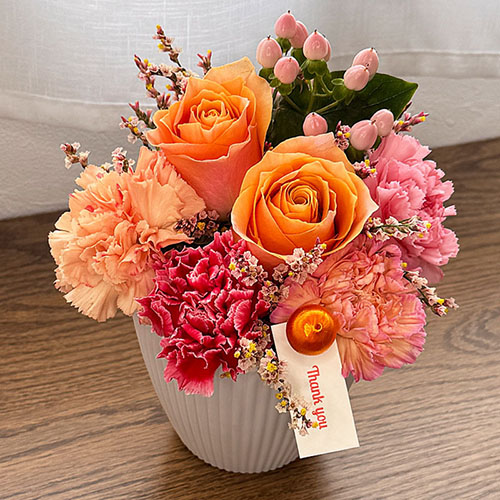 暖かいオレンジと甘く優しいピンク色のアレンジメントです。バラの花びらのグラデーションとカーネーションのグラデーションが重なりとても綺麗な暖かみを出してます。