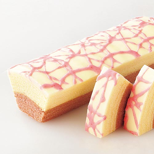 ホワイトチョコレートのクリームをチーズが香り立つさっくりとした生地に包み、チーズ風味の準チョコレートを飾りました。
