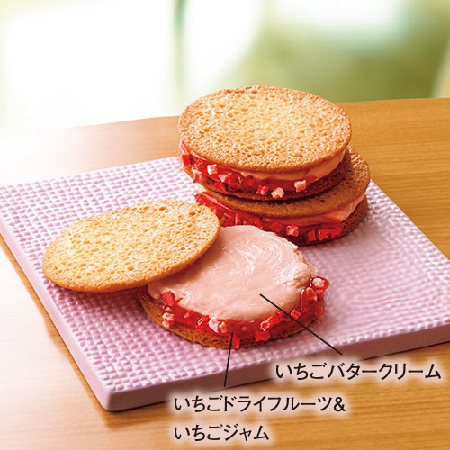 き花ガレットにいちごクリームを重ね、いちごジャムとドライいちごで華やかに仕上げた春の贅沢菓子。