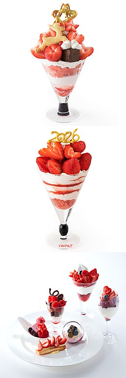 ピスタチオシューで描いた2026を飾り、新年らしい紅白のパフェに仕立てました。