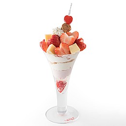 白を基調としたグラスにはソフトクリームや苺ババロアを重ね、華やかな赤色のハート型苺を飾りました。チーズケーキ、ハートのゼリーやチョコパルフェもトッピングし、ホワイトデーに華を添えます。