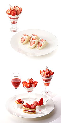 苺とホイップクリームの甘みが合わさったサンドウィッチや、苺ババロア、ソフトクリーム、ストロベリーシャーベットなどを重ねて仕立てたパフェをお楽しみいただけます。