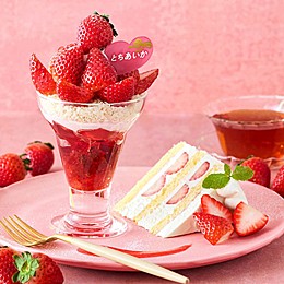 酸味が少なく甘さが際立つ「とちあいか」を贅沢に使用しました。ショートケーキはとちあいかをふわふわのスポンジと優しい甘さのホイップクリームでサンド。パフェは濃厚な味わいのブラウニー、ストロベリーハイビスカスティージュレ、ストロベリーローズホイップ、ストロベリージェラートとのハーモニーを楽しんで。