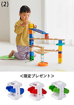 ブロックとレールでビー玉転がしのコースを組み立てるセット。鉄琴パーツ付きで、動きを目と音で楽しめます。数量限定でビー玉の動きを変化させる「コントロールブロックセット」をプレゼント。
