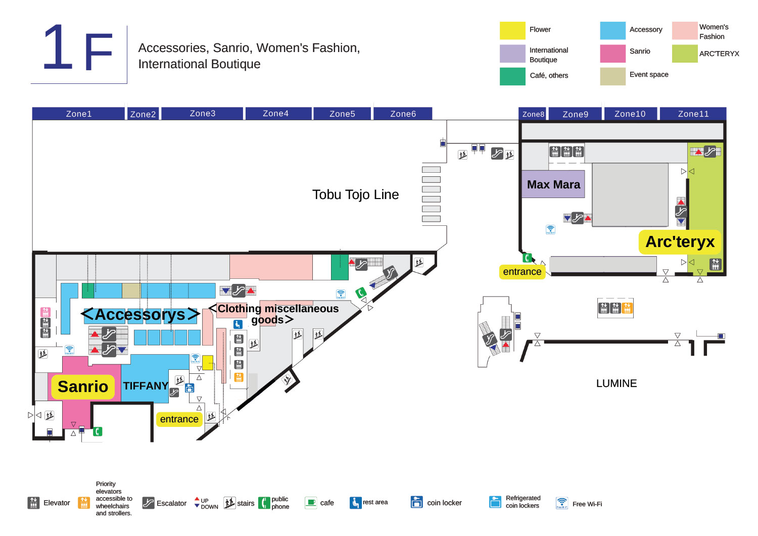 | 1F | 配饰、sanrio、时尚女装、国际精品店 |