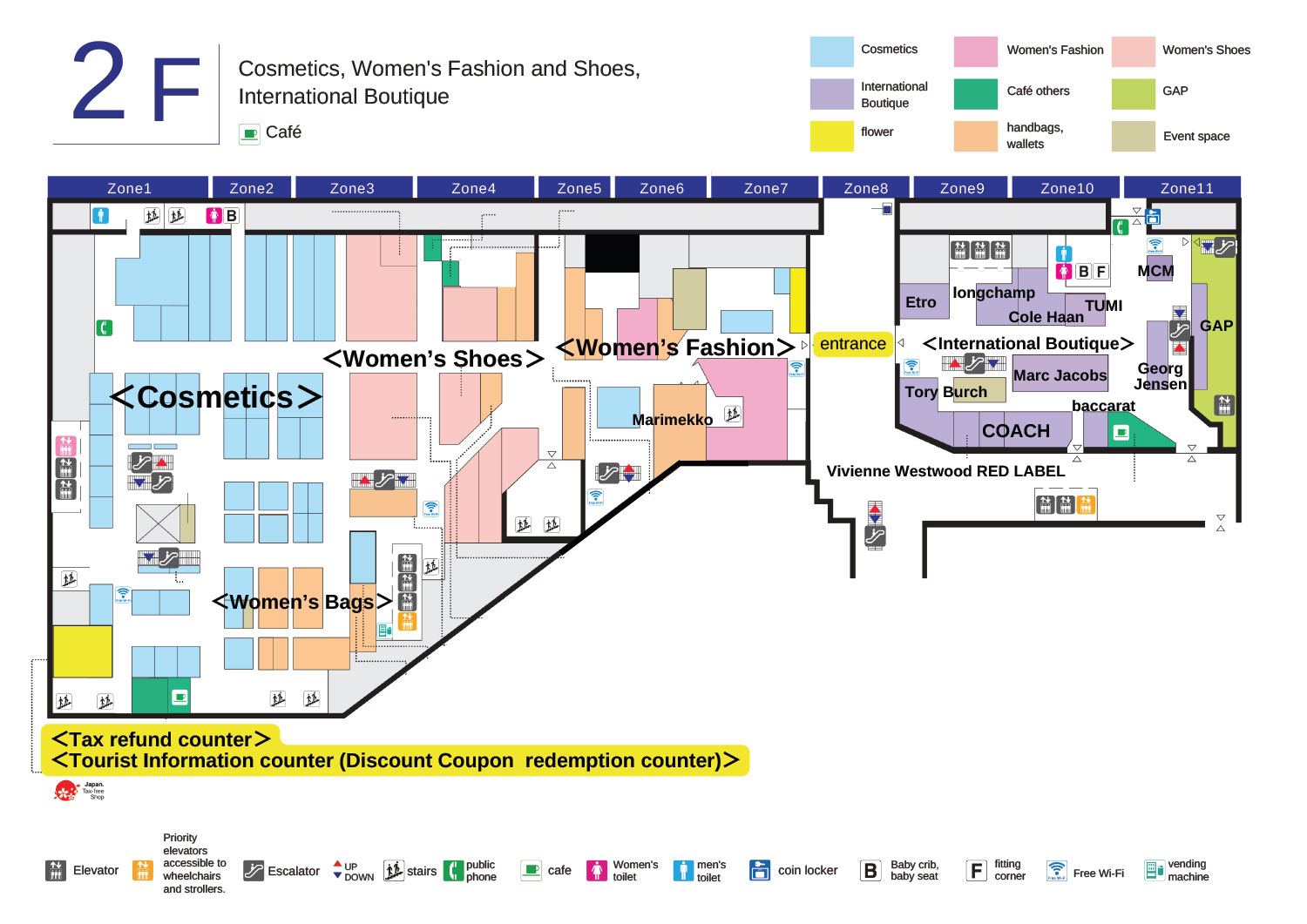 | 2F | 化妆品、女士时装和鞋子、国际精品店 |