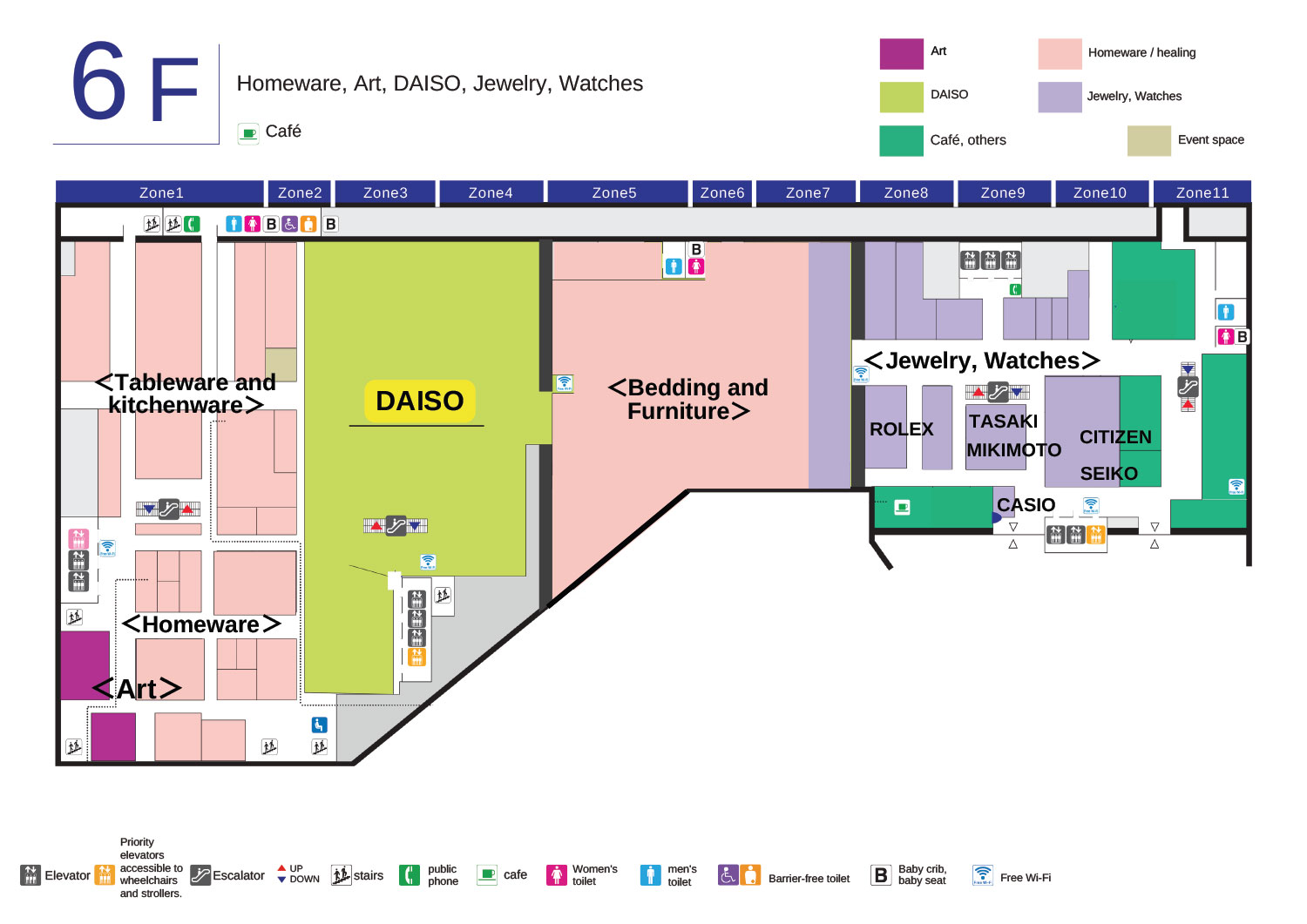 | 6F | 家居用品、艺术品、DAISO、珠宝、手表 |