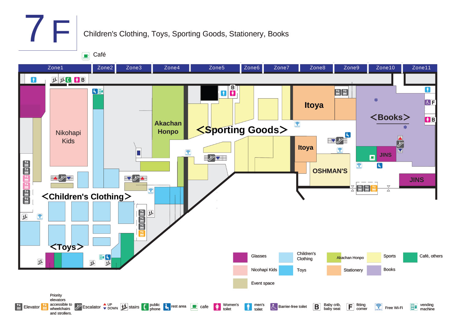 | 7F | 儿童服装、玩具体育用品、文具、书籍 |