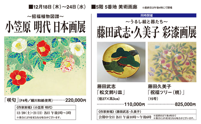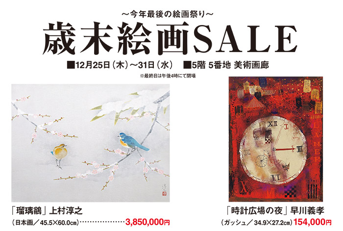 イベントガイド 5階5番地 美術画廊からのお知らせ Tweet 会期 2025年12月18日(木)~31日(水) 美術画廊 ※万一、売切れの際はご容赦くださいませ。 ※諸般の都合により、営業時間・催事内容が変更となる場合がございます。 イベント一覧