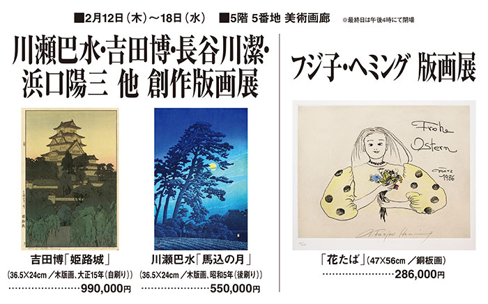 イベントガイド 5階5番地 美術画廊からのお知らせ Tweet 会期 2026年2月5日(木)~18日(水) 美術画廊 ※万一、売切れの際はご容赦くださいませ。 ※諸般の都合により、営業時間・催事内容が変更となる場合がございます。 イベント一覧