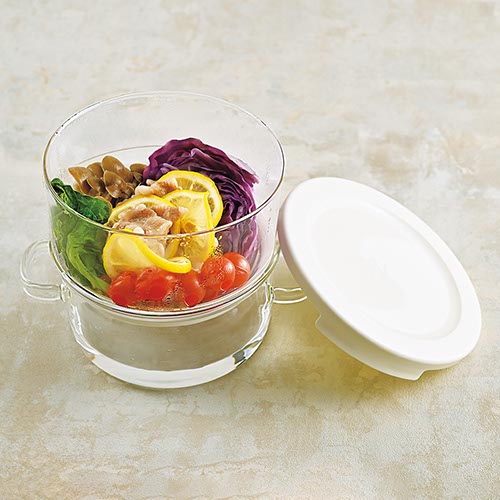 上下とも耐熱ガラス製なので、電子レンジで一度に二つの調理が可能。上段には穴が開いていて蒸し料理も楽しめます。