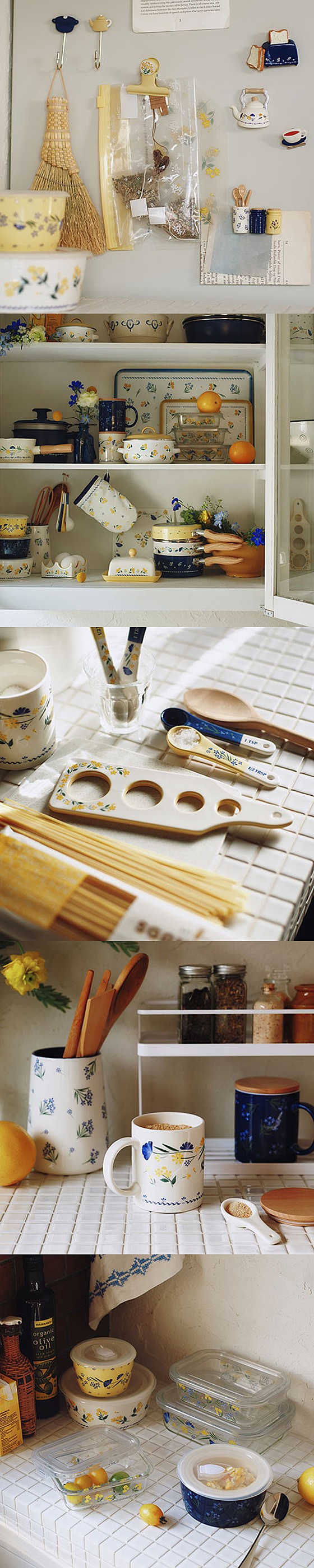イエローやブルーの花をモチーフにしたデザインで、キッチンを華やかに彩るアイテムです。心にちょっとしたゆとりを添えて、お料理の時間をもっと楽しく!
