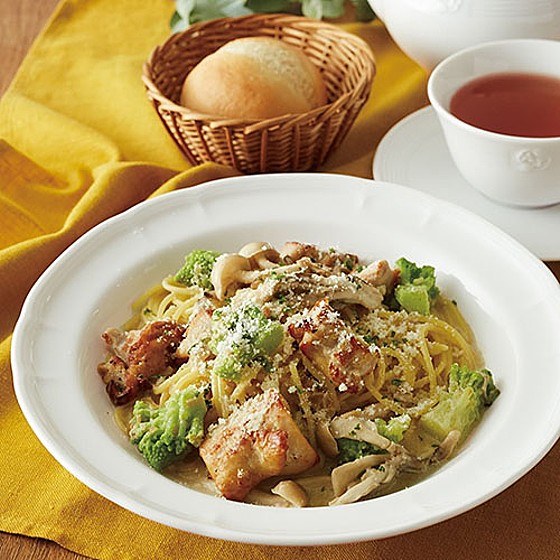 ポルチーニや、たまり醤油などを使用したコクのあるクリームソースに、ローストチキンと舞茸、しめじ、ロマネスコを合わせました。