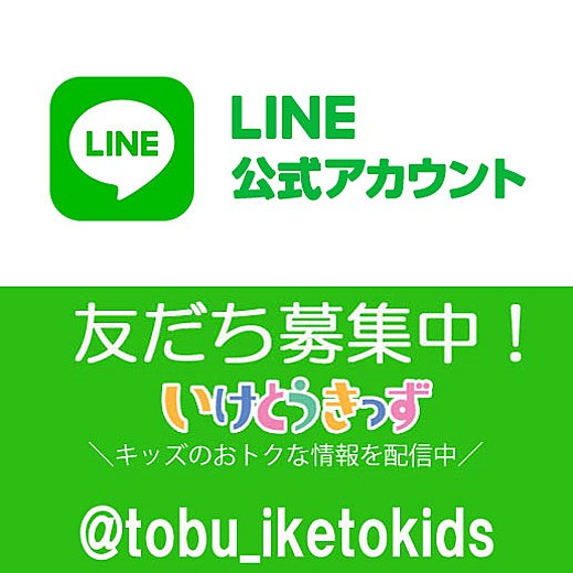 イベントガイド LINE公式アカウント いけとうきっず 友だち募集中! Tweet 会期 2017年7月13日(木)~ いけとうきっず 公式SNS キッズのおトクな情報を配信中! スマートフォンからご利用の方はLINEアプリを立ち上げ、 下記ボタンをタップすると友だち追加できます。 イベント一覧