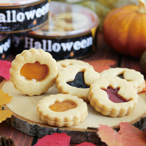 かぼちゃにお化けに魔女の帽子、ハロウィンモチーフのクッキーでストロベリー、アプリコット、カシスの3種類のジャムをサンドした焼き菓子です。