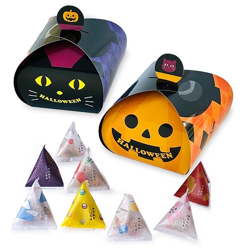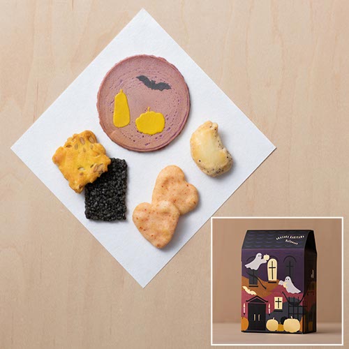 開けると可愛いおばけが登場するお家型の仕掛け箱に、ひとくちサイズのあられを個包装で詰合せました。
