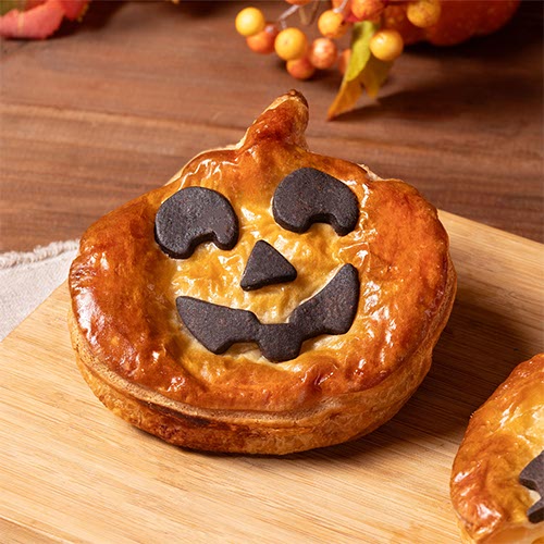 サクッと香ばしいかぼちゃ型のパイにかぼちゃクリームを包み、ジャックオランタンの顔を描きました。