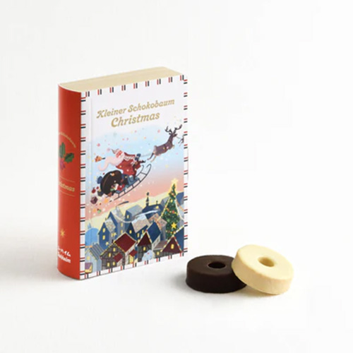 チョコレートをコーティングしたかわいらしいサイズのバウムクーヘンを小分け包装して、ブック型のパッケージに詰合せました。