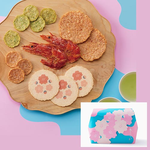 出会いの春のごあいさつや贈りものに。心はずむ季節の味わいをちりばめた海老せんべいを青空と満開の桜をイメージしたパッケージに詰合せました。