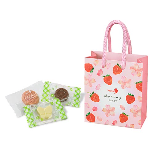 さくらといちごが愛らしく描かれたミニバックには春を彩る花型やチョウ型のチョコレート、いちごのクッキーなどを詰合せました。