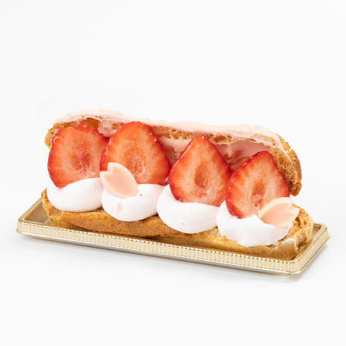 ザクザクのクッキー生地をのせ焼きあげたエクレアで、旬のあまおういちごと特製のいちごショコラクリームをサンド。
