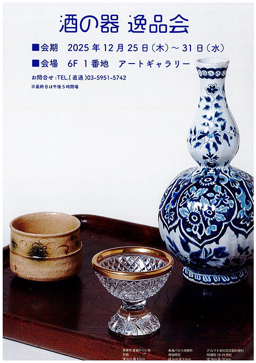 このたびアートギャラリーにおきまして『酒の器 逸品会』を開催させていただきます。物故の有名作家をはじめ現代の巨匠から人気若手作家まで、酒器の逸品を一堂に集め展示即売いたします。備前、唐津、志野、織部、伊賀、信楽、色絵、染付など、それぞれの技法や感性が息づく徳利やぐい呑みの数々をご紹介いたします。
