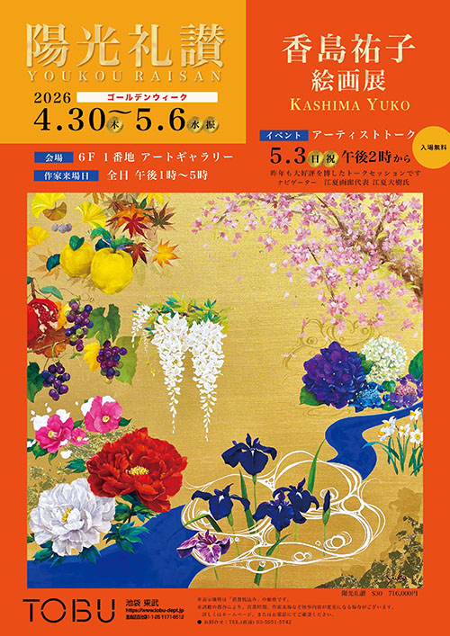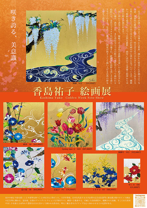 美しい花々や色鮮やかな海の景色など、心で捉える現象を色彩豊かに描く香島祐子氏。油彩画でありながら金箔やプラチナ箔が巧みにほどこされた、日本画の粋をも感じさせる現代的な感覚の作品をご紹介いたします。