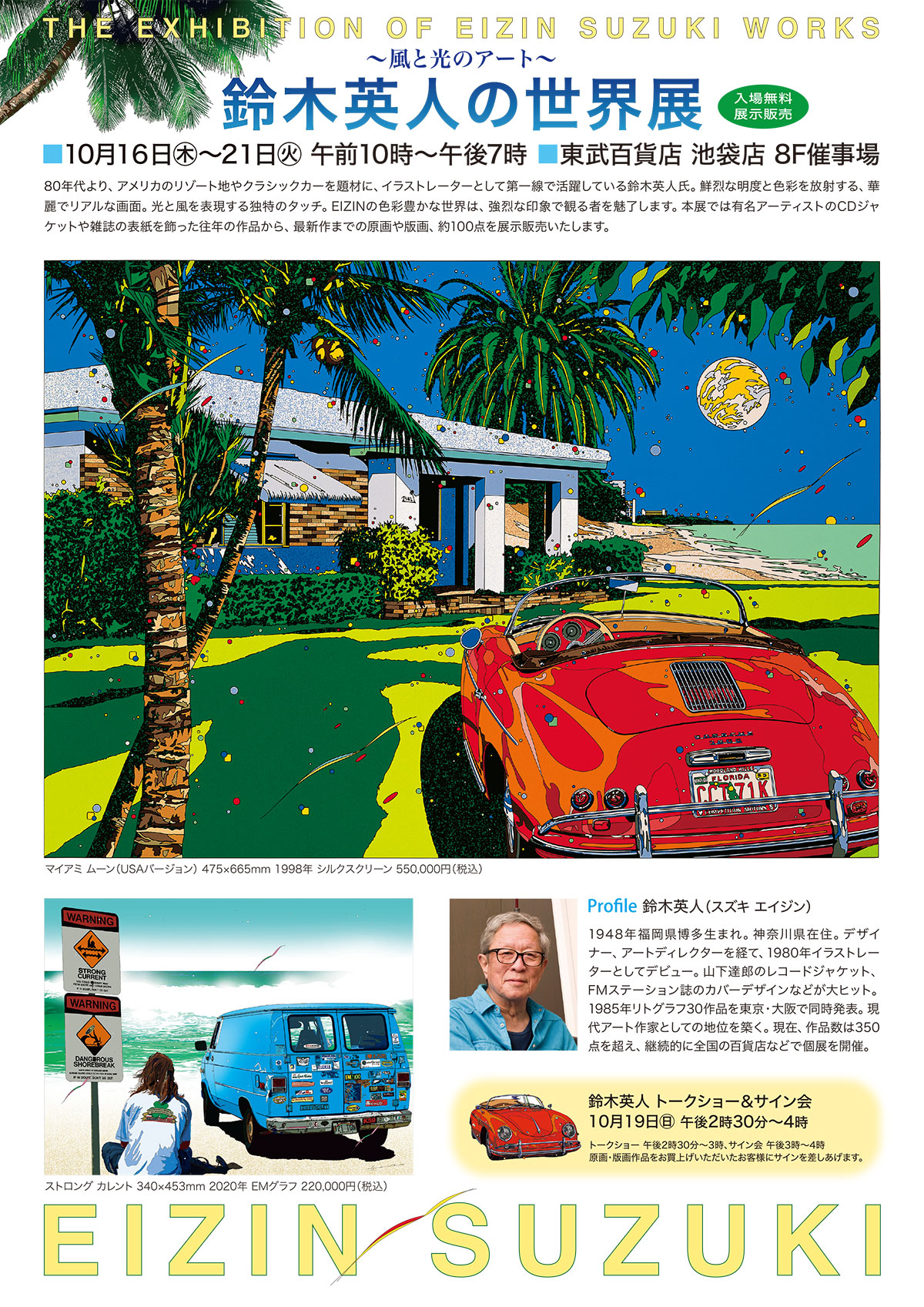 イベントガイド 8F催事場 <予告>~風と光のアート~鈴木英人の世界展 Tweet 会期 2025年10月16日(木)~21日(火) 営業時間:午前10時~午後7時 鈴木英人イラストレーター展示販売 鈴木英人公式サイトはこちら ※諸般の都合により、作家来場など催事内容が変更となる場合がございます。 イベント一覧