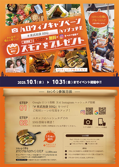 イベントガイド 8F屋上 ビアフェスタ2025 ハロウィンキャンペーン Tweet 会期 2025年10月1日(水)~31日(金) ビアフェスタハロウィンキャンペーン スモアをプレゼント! Google口コミ投稿又はInstagramハッシュタグ投稿で「#東武池袋BBQ」をつけてご利用シーンの写真をアップで 店舗でスモアをプレゼントいたします。 イベント一覧