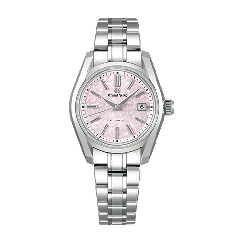 グランドセイコー初の自動巻メカニカルモデル「62GS」を現代的解釈によってアレンジし、日本特有の季節の移ろいをダイヤルに宿した小型メカニカルモデル。「62GS」デザインは、ベゼル(ガラス縁)のない構造によって広々と見えるダイヤルや、「ザラツ研磨」によって実現したシャープな多面体からなるケースが特徴です。ダイヤルは、桜の花を雪が覆い隠す「桜隠し」から着想を得ました。グランドセイコーのメカニカルモデルの製造を担う「グランドセイコースタジオ 雫石」が位置する東北地方で、春のはじまりに見られる風景です。雪と桜が共存する、春の儚く美しい情景を、繊細な型打ち模様とグレイッシュなピンク色で表現しています。 -