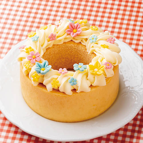お花のかわいいリースをのせたバウムクーヘンでお誕生日をお祝いしよう。