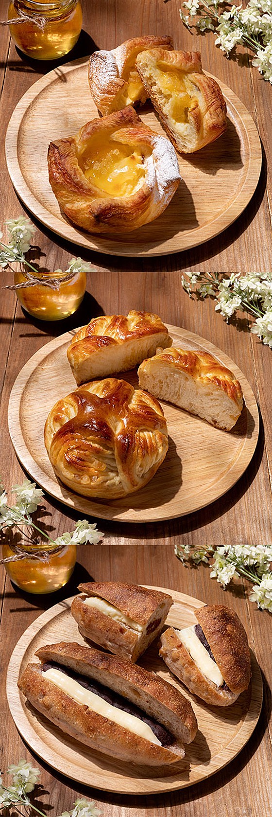 デニッシュにチーズクリームを絞ってアカシアはちみつをトッピングした爽やかなレモンがアクセントの「ハニーチーズ」をはじめ、はちみつを合わせたバターと藻塩入りの粒あんを、香ばしいクルミのフランスパンでサンドした「はちみつバターあん」など期間限定の味わいをご用意しております。