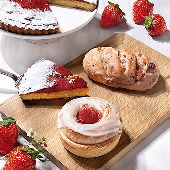いちご果汁を合わせた風味豊かなアーモンドクリームと、甘酸っぱいいちごの味わいがひろがる「いちごのタルト」をはじめ、ドライストロベリー、マカダミアナッツ、ホワイトチョコの入ったカンパーニュに、ほのかに香るバジルとオリーブオイルがアクセントの「マカダミアいちご」など期間限定の味わいをご用意しております。
