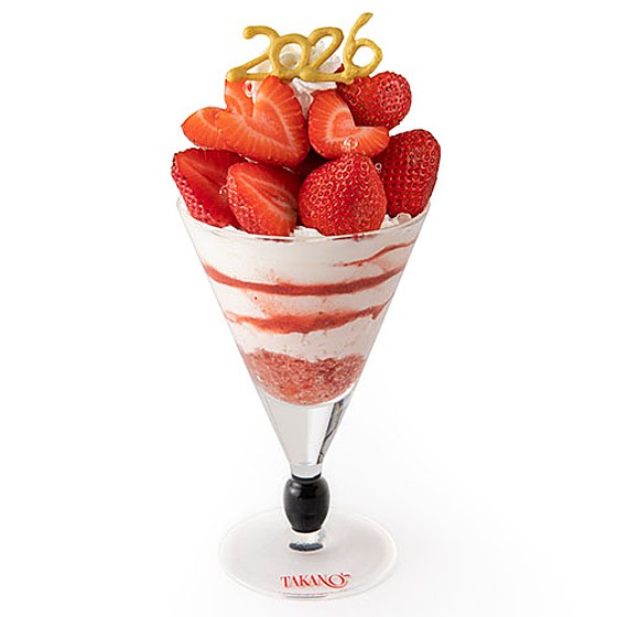 ピスタチオシューで描いた2026を飾り、新年らしい紅白のパフェに仕立てました。