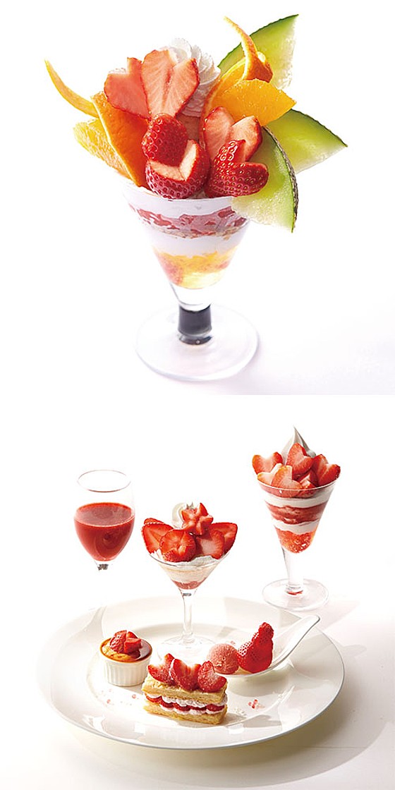 デザートプレートには苺ジャムやヨーグルトクリーム、スポンジを重ねて苺を飾ったグラスや、ミルフィーユ、カスタードのココットなどを。その他、苺のジュースやパフェもご一緒に、苺を様々な形でお楽しみいただけます。